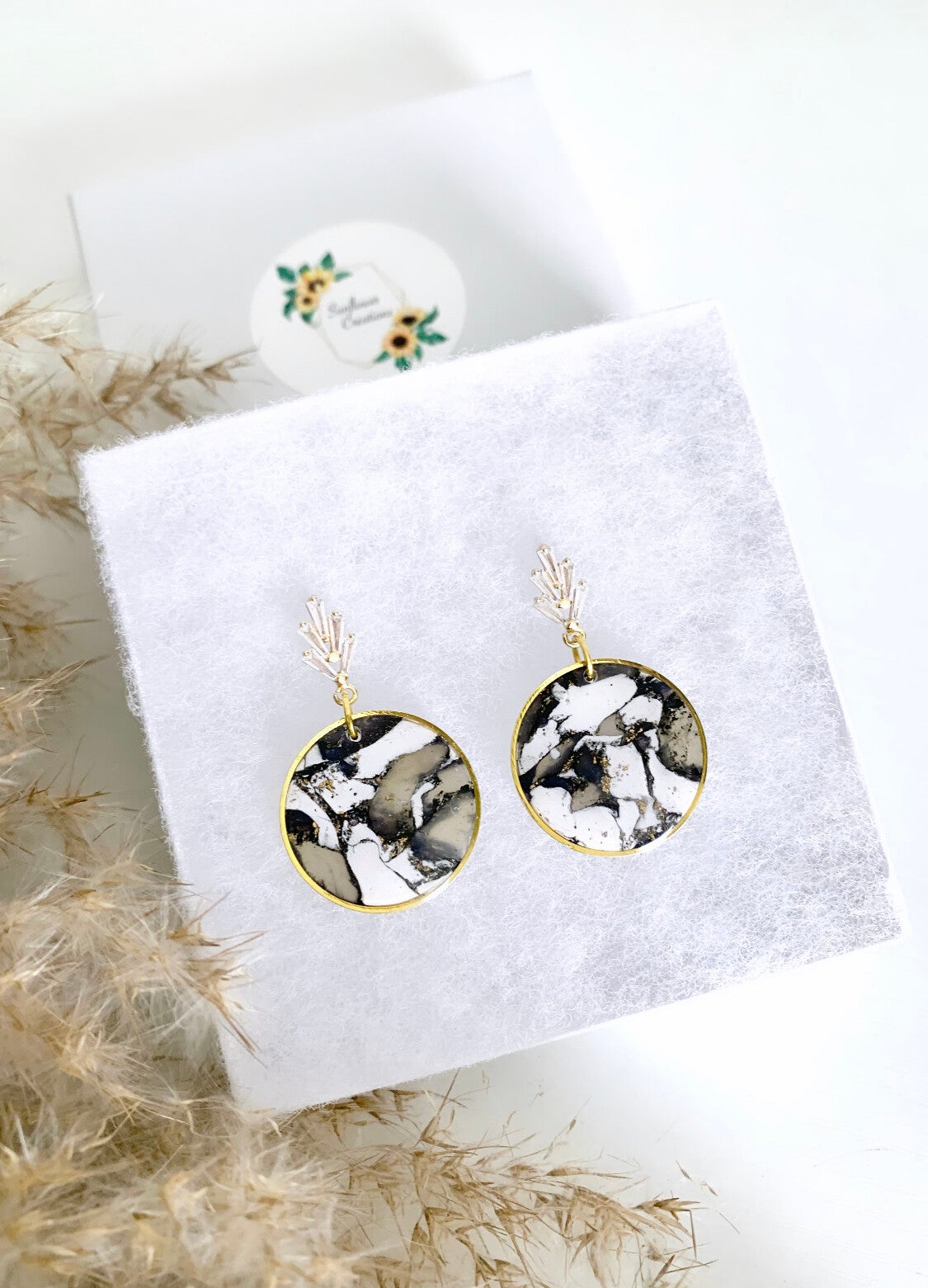 Get ready to elevate your style with these exquisite polymer clay earrings, boasting a marble effect in white, translucent, and black. I have added gold flakes to the clay piece as well. Handmade to perfection, they feature a brass circle detail around the clay piece. A glossy epoxy resin coating that amplifies their beauty. Paired with a sparkly clear gem at the top, these statement earrings are both classy and elegant. Don't let their appearance fool you – they're incredibly light. A must-have accessory!