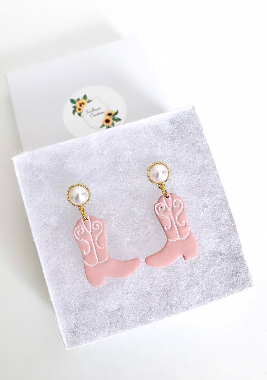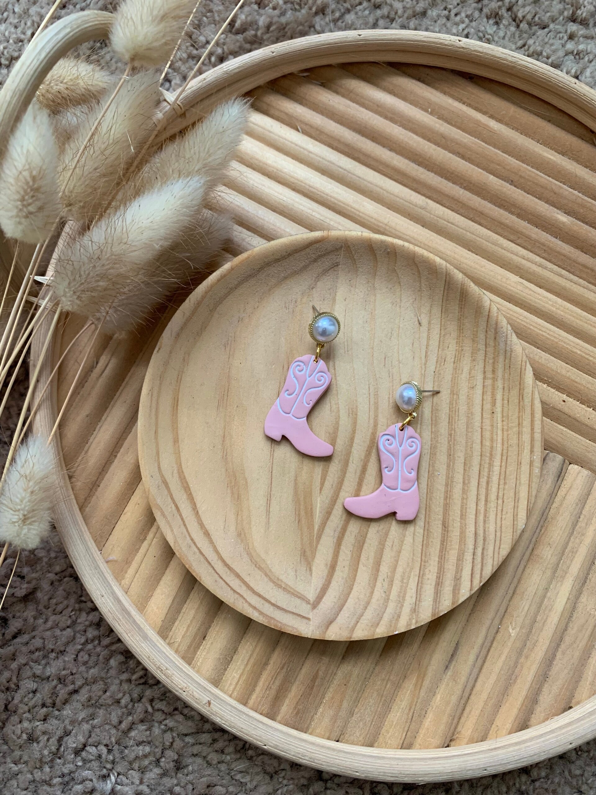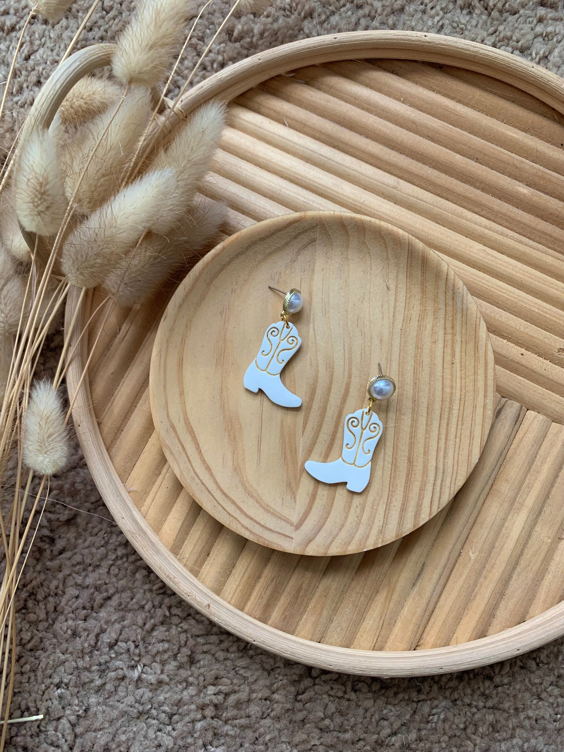 How fun are these cowgirl boots?! I paired them up with those cute pearls, it gives it a feminine touch, wouldn’t you agree?! They are fun, sassy, light, and are made of polymer clay. These are the earrings you need for a country concert!