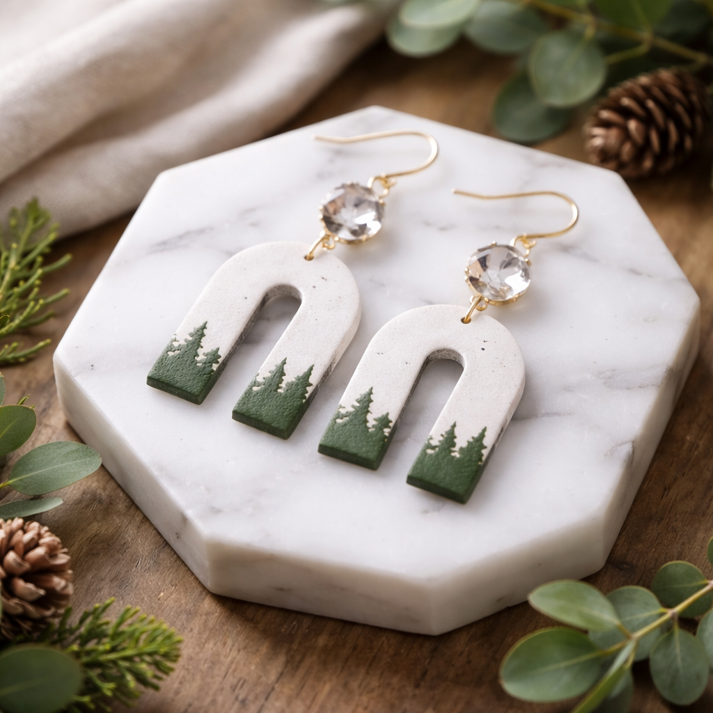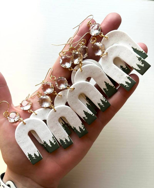 How gorgeous are these?! Going with a rustic pine tree feels here. They give Colorado vibes. They are made of polymer clay and are very light. The pine trees were done with acrylic paint.