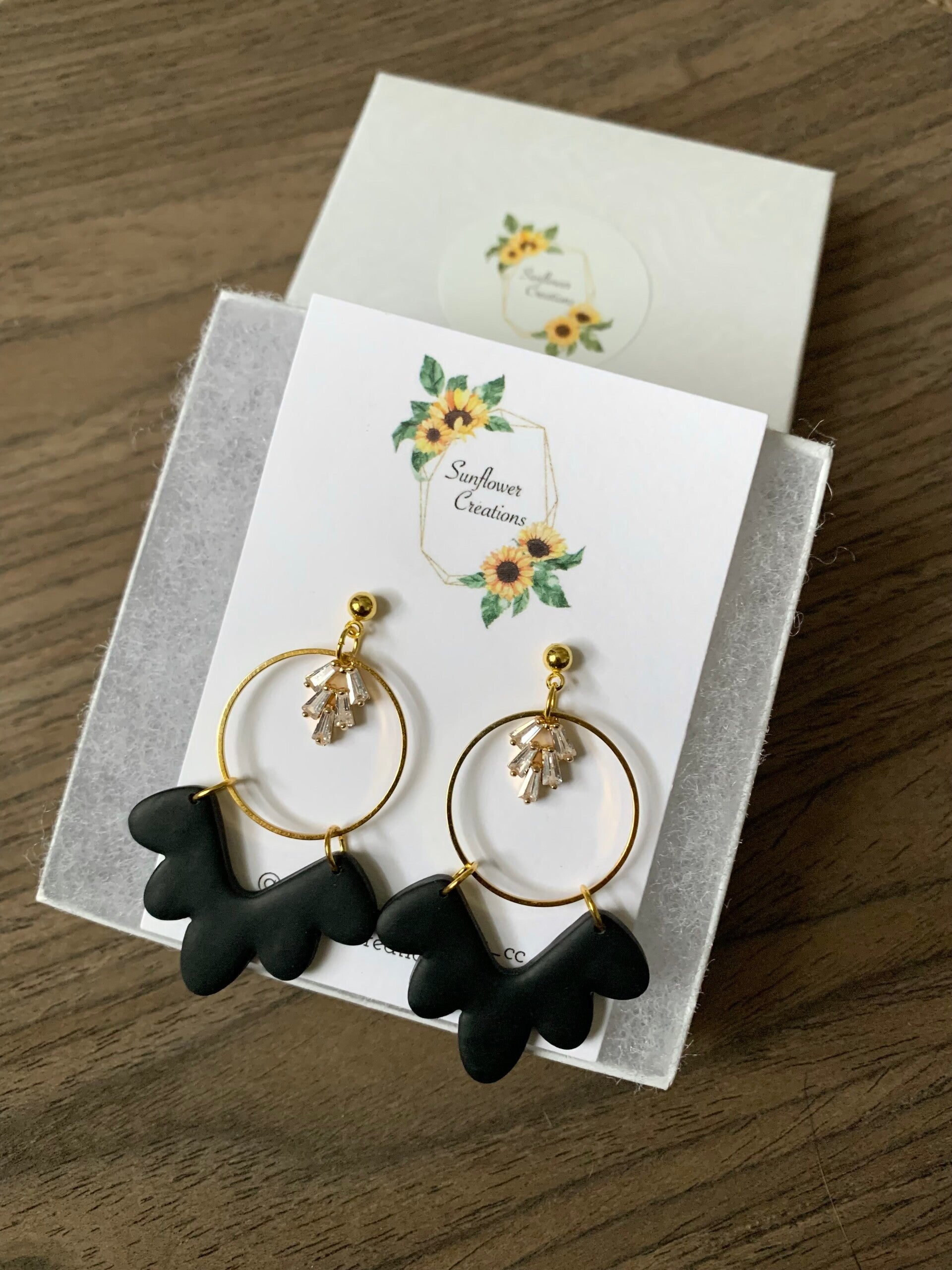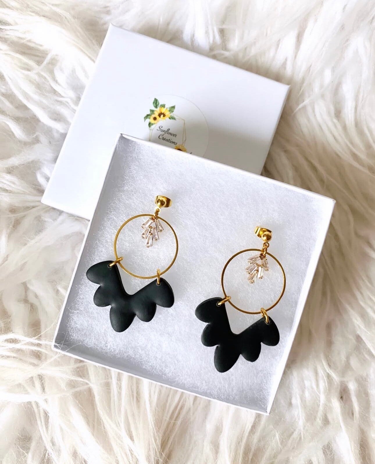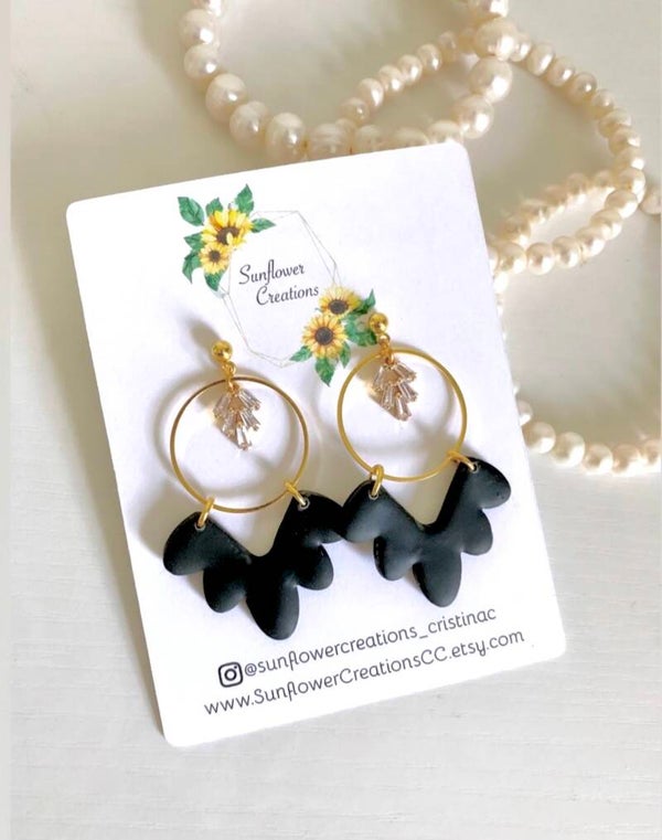 Add a touch of elegance to your little black dress with these gorgeous black statement earrings. They feature a beautiful brass circle and sparkly gem, made with polymer clay. Handmade with love, they're the perfect accessory for any occasion.