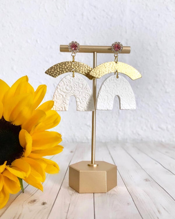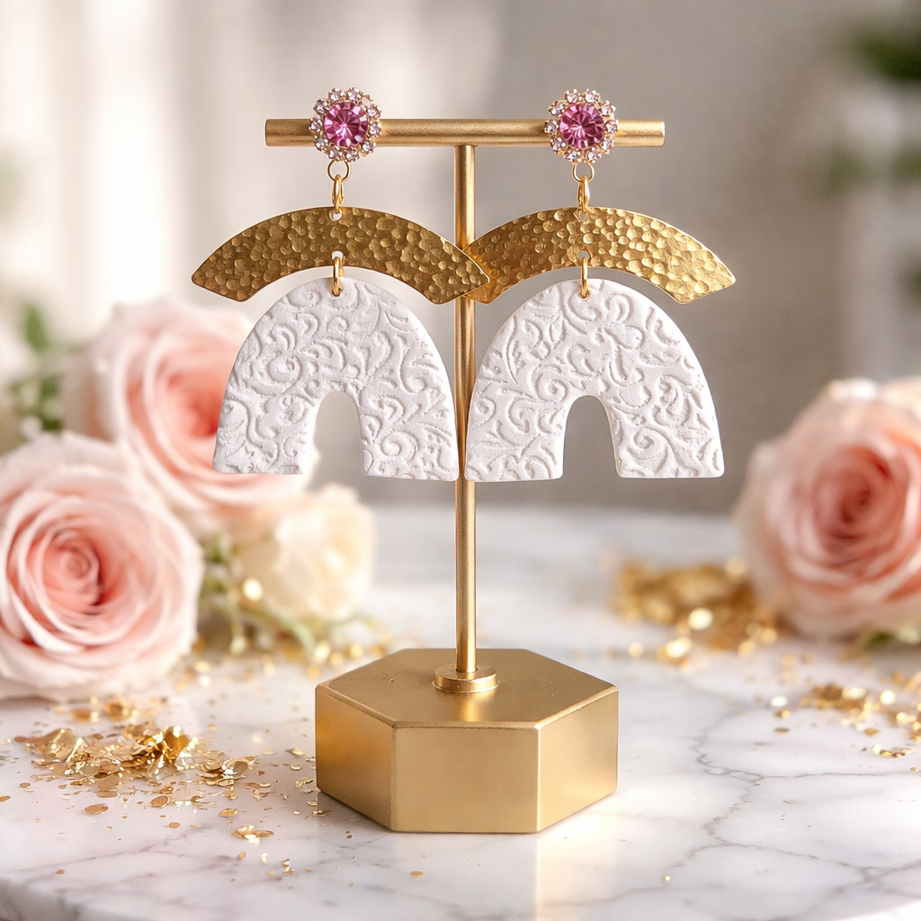 Handmade statement earrings crafted from polymer clay. Perfect for elevating multiple outfits. White earrings are a must-have! They feel super light and comfortable to wear. I paired them with a cute pink flower rhinestones for a touch of sparkle. The addition of a brass piece gives it extra flair, especially with its hammered design.