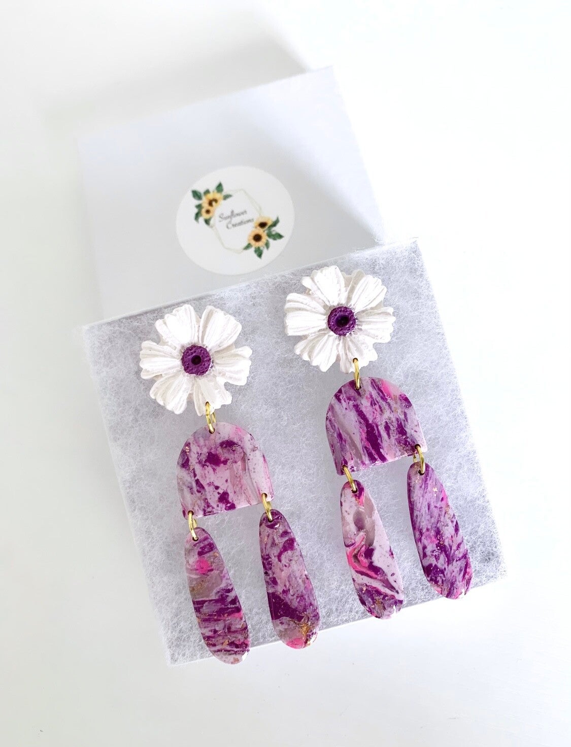These cuties are handmade and made of polymer clay. They have gold hypoallergenic posts on the back. The purple clay pieces have a glossy layer of epoxy resin. They are so fun and are the statement earrings you need! They are long and may look heavy but they are only 0.04oz. Super light! These earrings are perfect for this Spring or Summer! A MUST have!