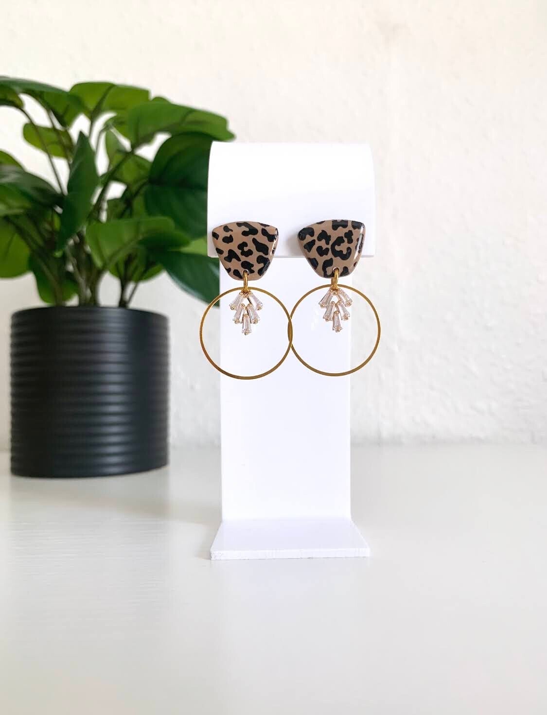 Animal print is a must-have! I'm obsessed with leopard/cheetah print! These handmade earrings are made from polymer clay with gold hypoallergenic back posts. The resin layer gives them a glossy finish, and they feature a brass circle and a stunning gem!