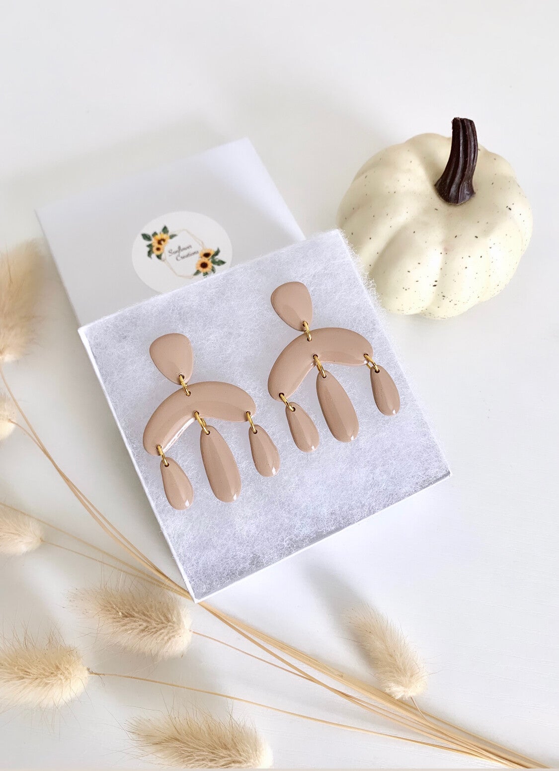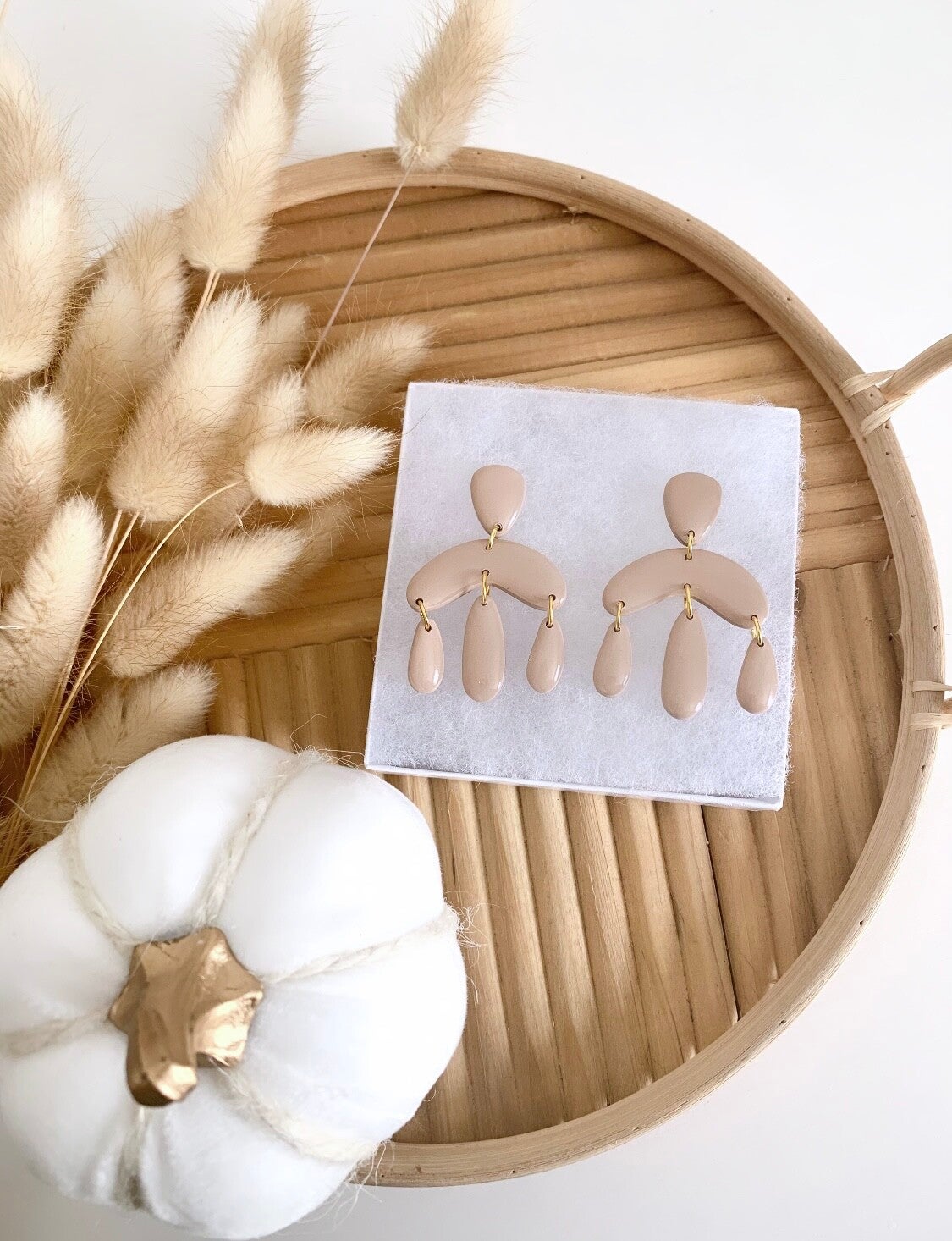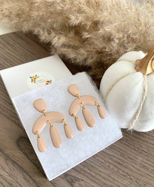 These earrings are made of polymer clay. I chose a nice beige color because neutrals are in style! They are easy to match with, they have a boho style, and are very light. I also gave them a glossy layer of epoxy resin for that gorgeous shine.