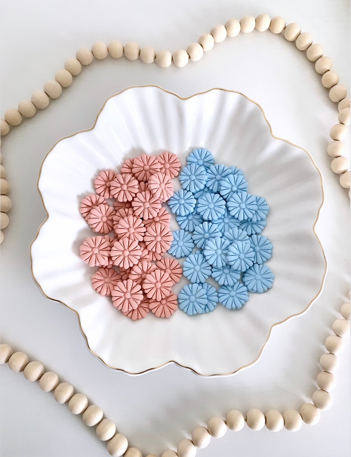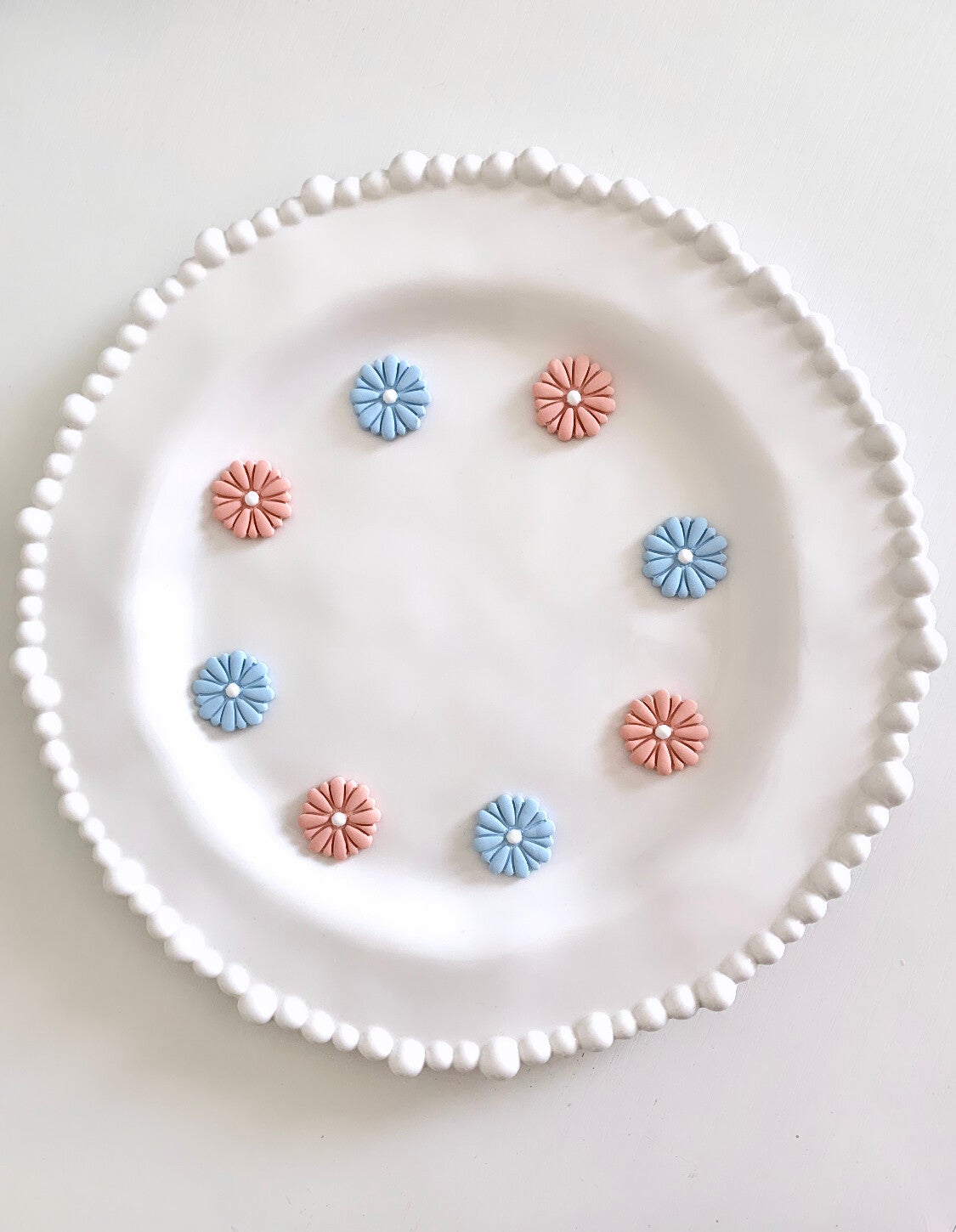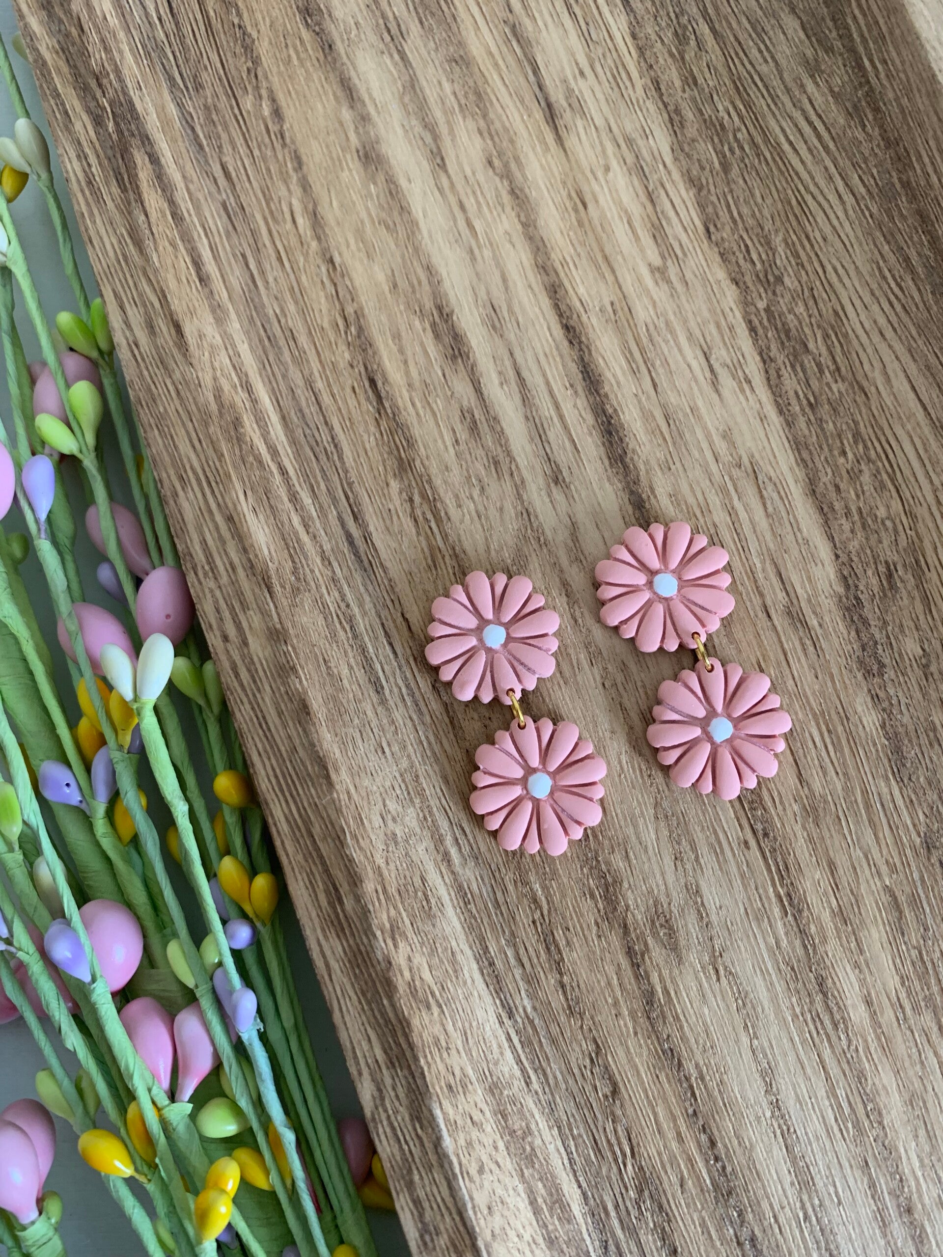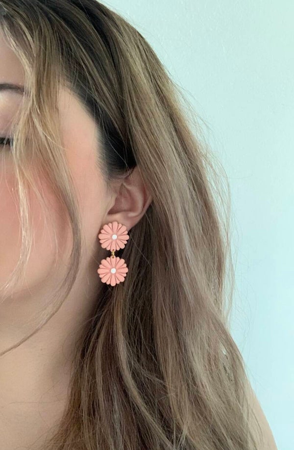 These flower dangles are so cute! They scream: Spring! They are handmade and made polymer clay. The center was painted with white acrylic paint and have gold hypoallergenic posts on the back. They will go with your Spring or Summer outfit this year. Available in two colors: Blue or Peach