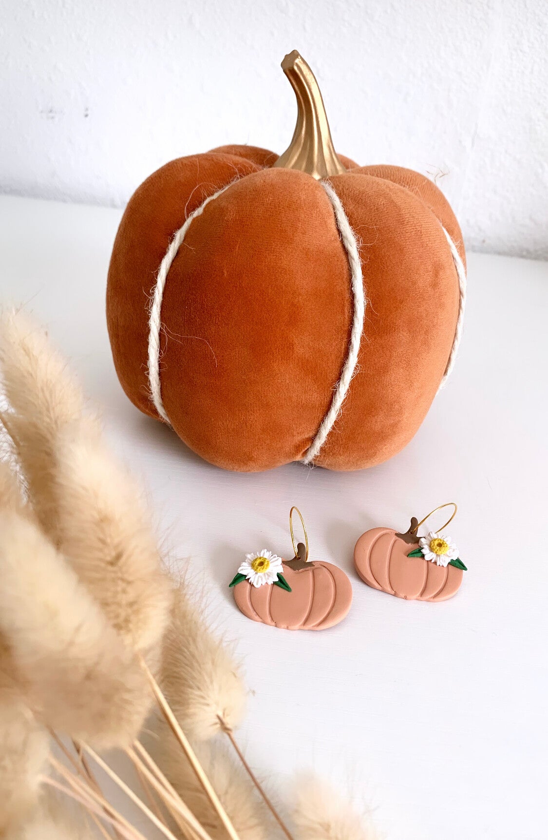 These floral pumpkins are too cute to pass! They are a great gift too! They are super light and comfortable. They are made of polymer clay and have acrylic painted stems.