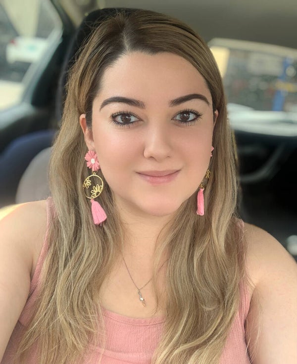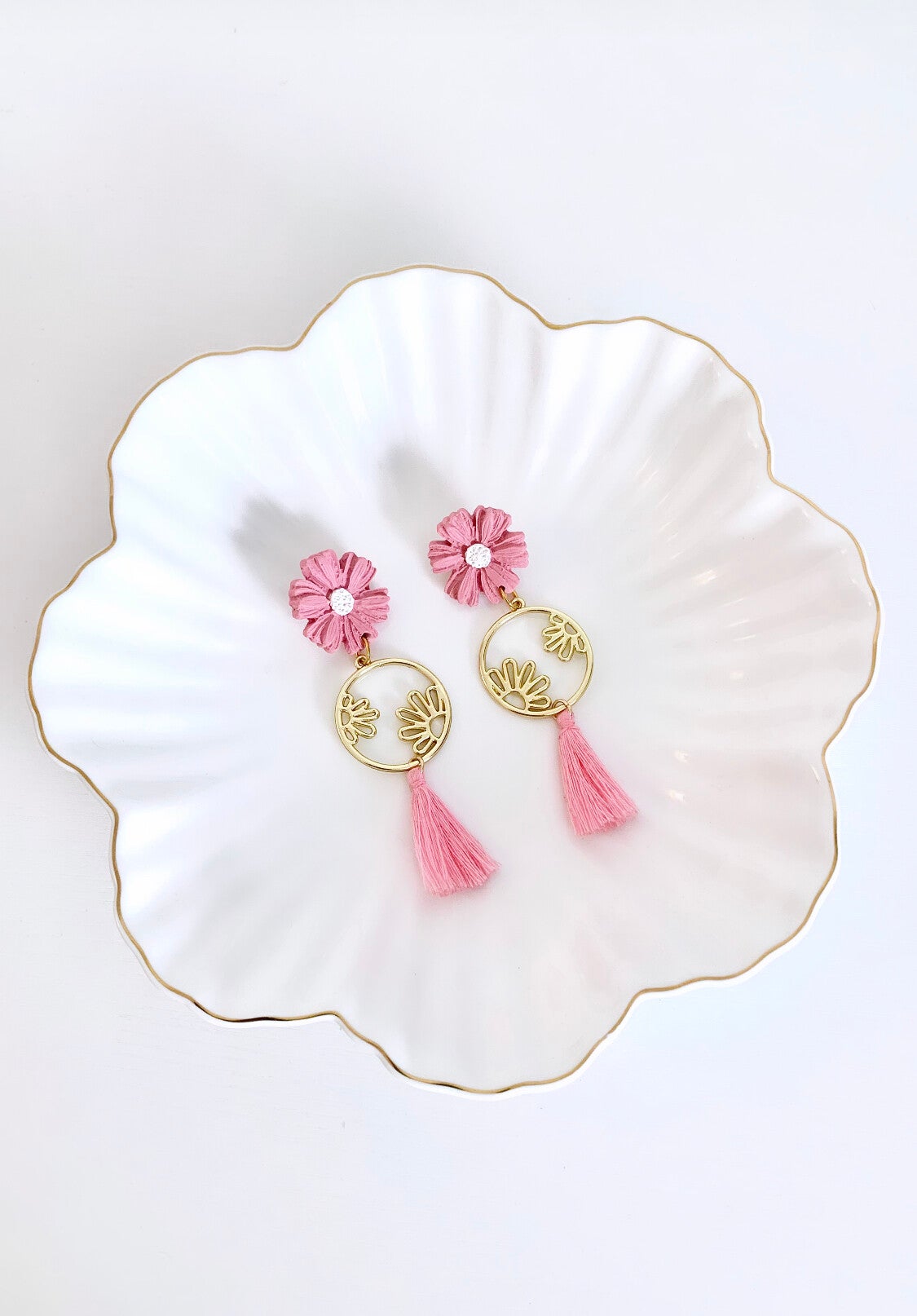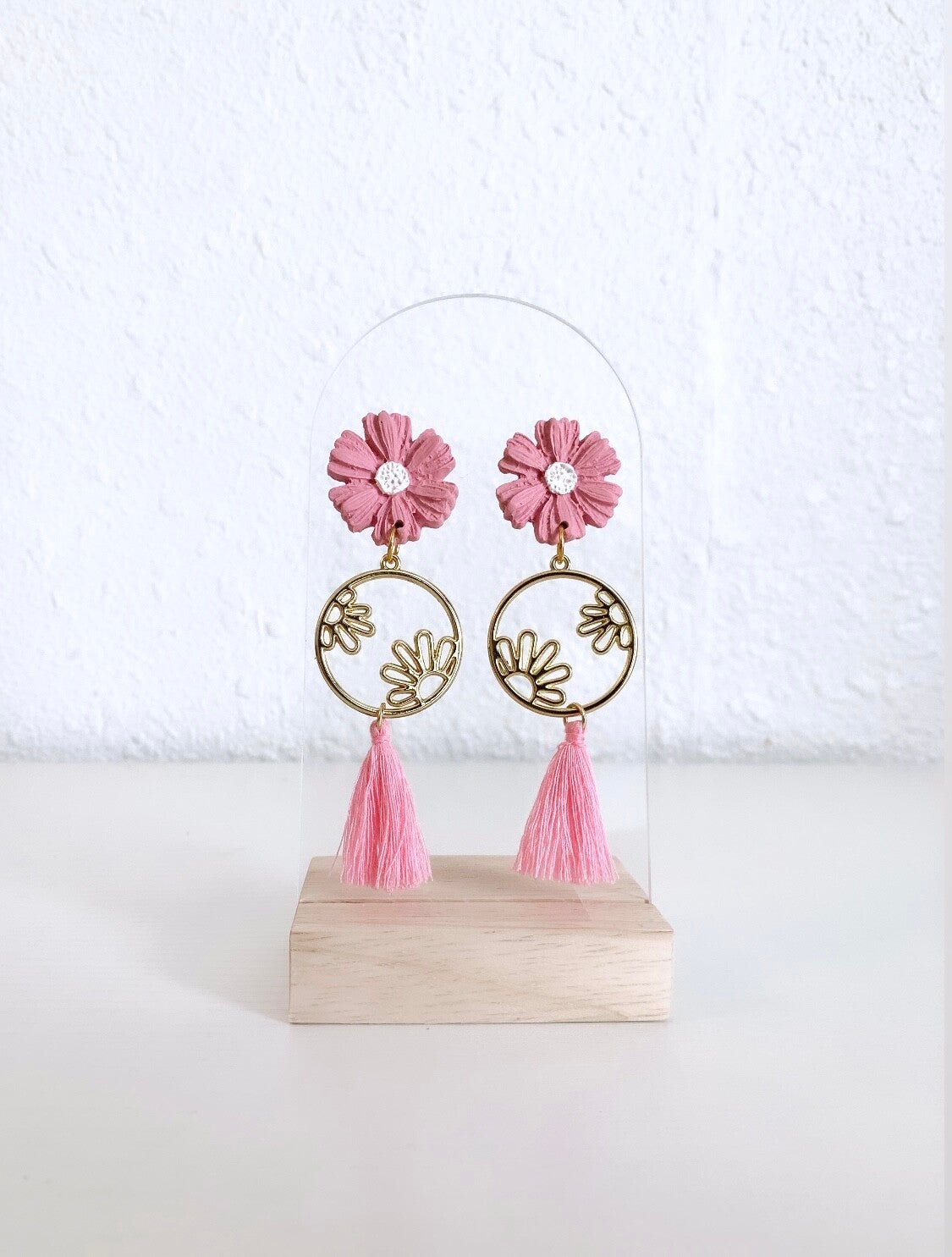 Aren’t these cute?! The pink flower is crafted from polymer clay and paired with a flowery brass piece. The hot pink tassels give them just the right amount of sass. These earrings are so girly and fun. They are also light. You need these pink statement earrings!