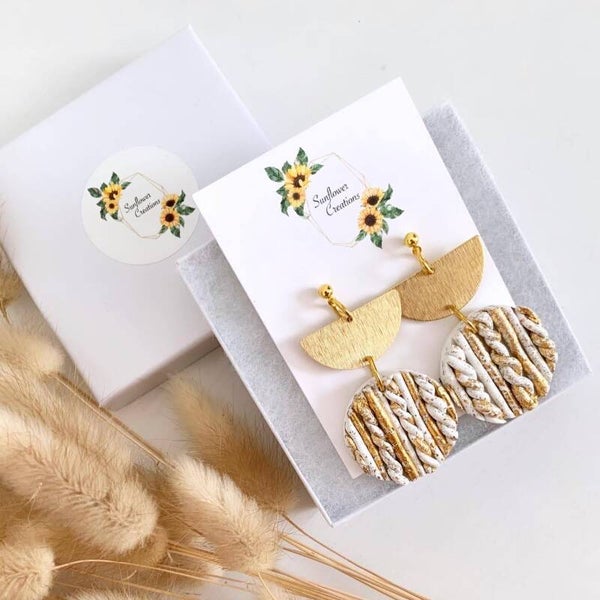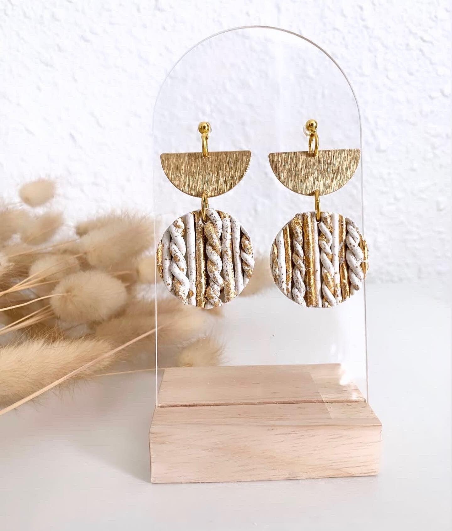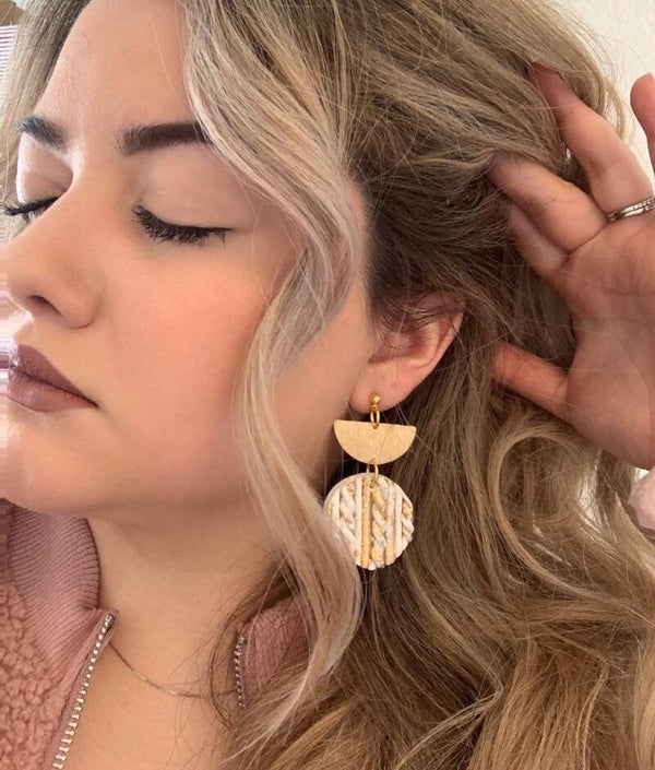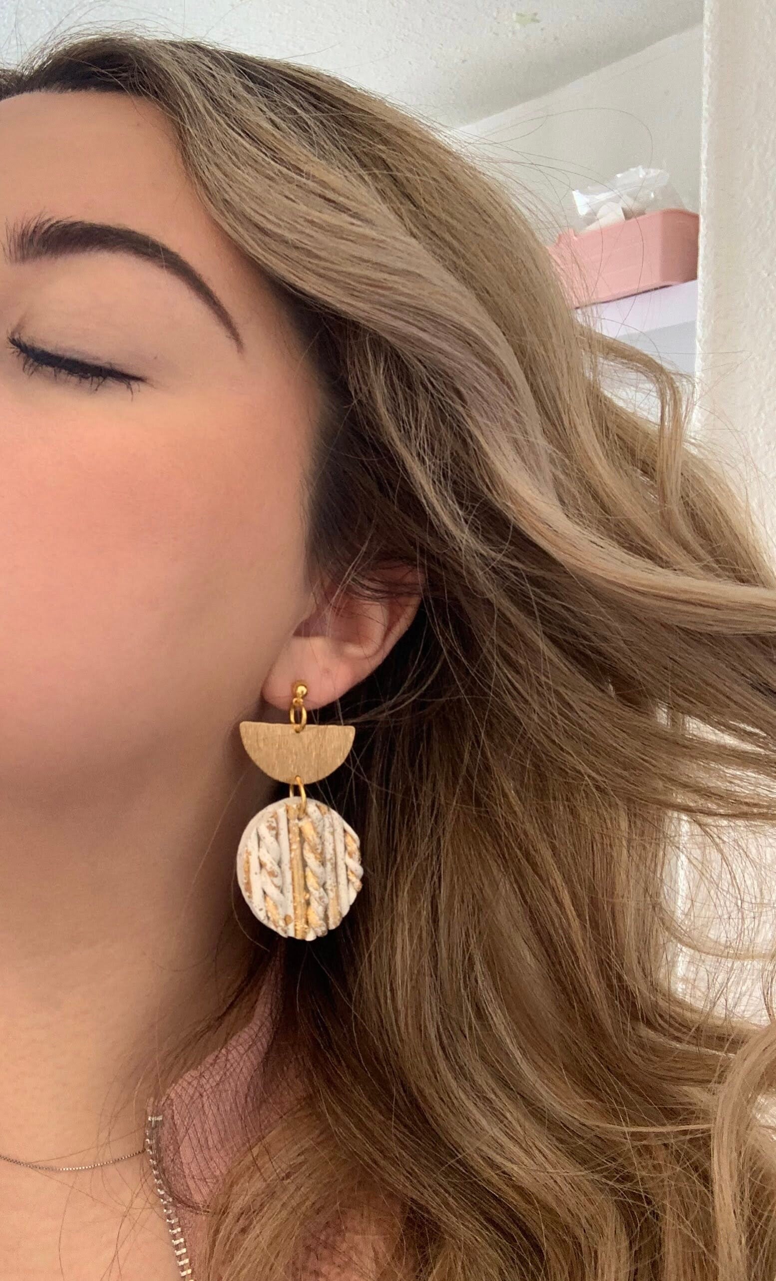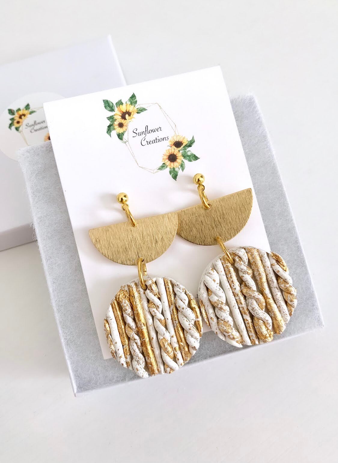 Get ready to make a statement with these handmade earrings featuring a unique sweater texture. They're designed to complement your favorite sweater perfectly. With a dash of gold flake and a stunning semi-circle brass piece, they're sure to turn heads. And the best part? They're incredibly light, weighing just 0.6oz.