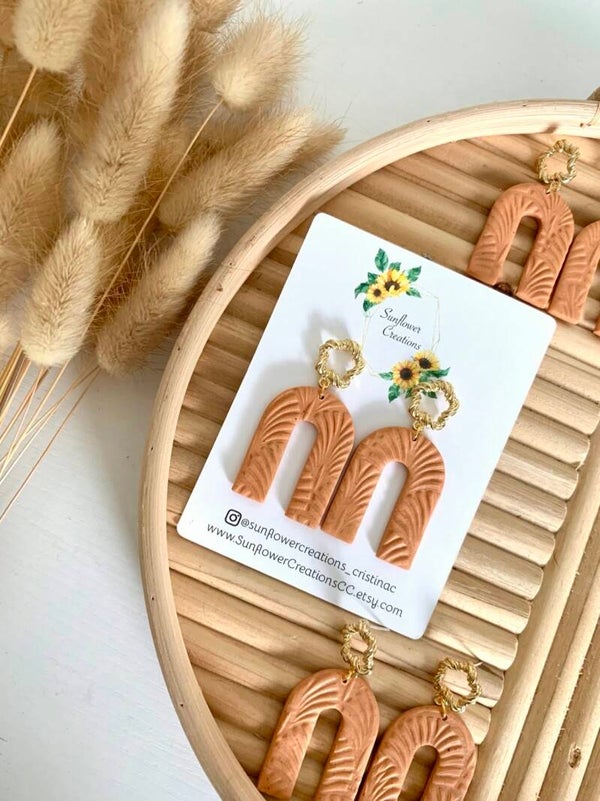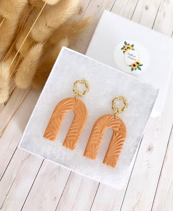 Get ready for fall with these must-have earrings! Handmade light orange arches in polymer clay feature an abstract texture and light shimmer. Brass details at the top give them a lovely finish. Ideal for completing your fall look.