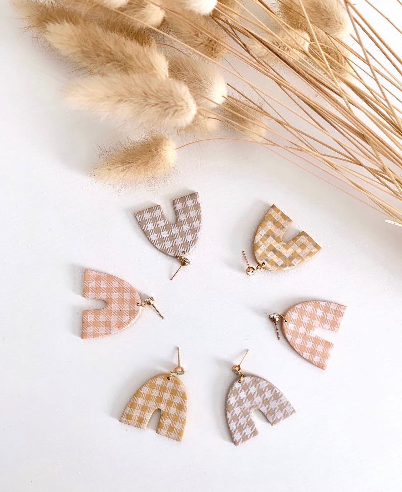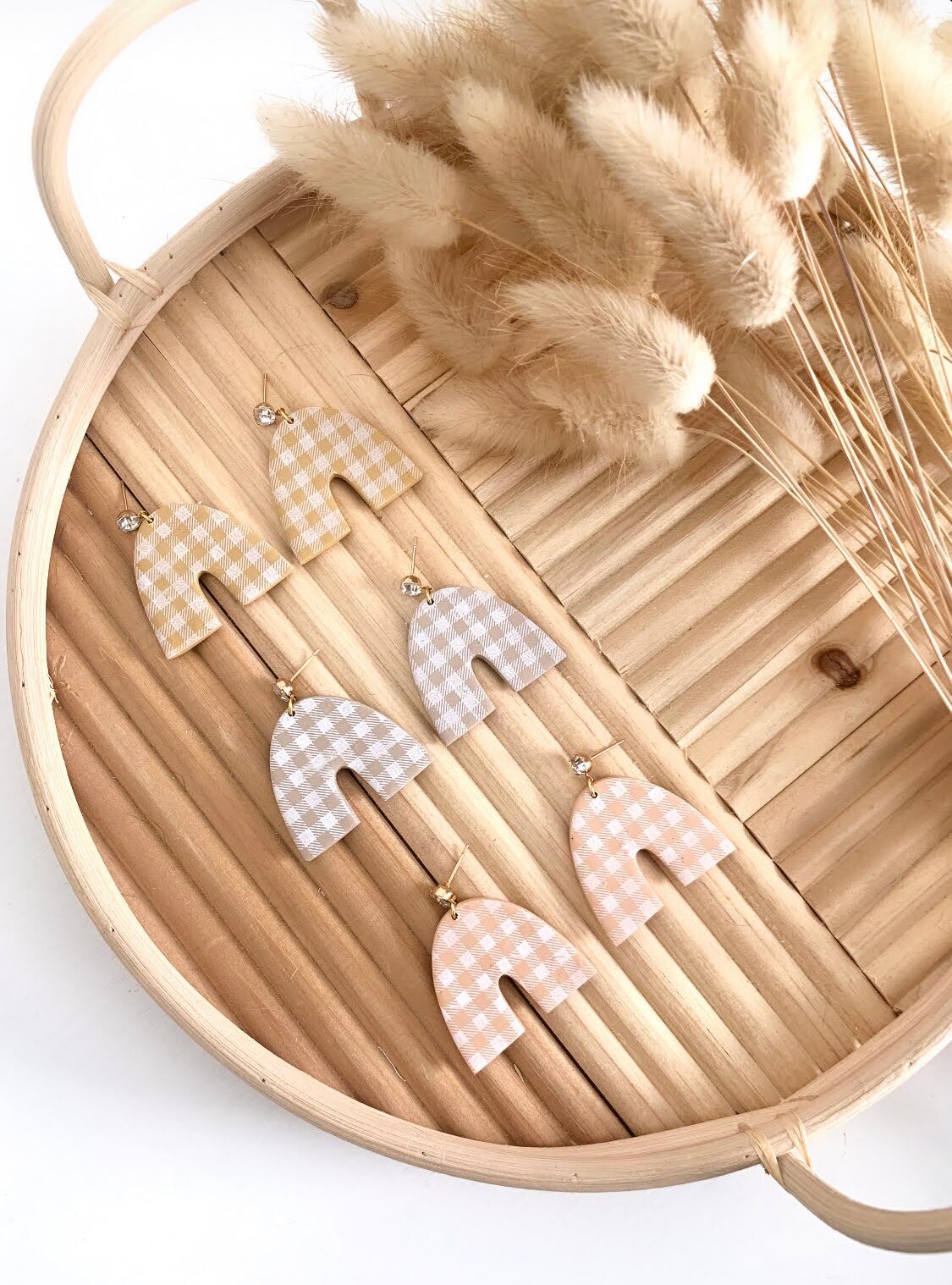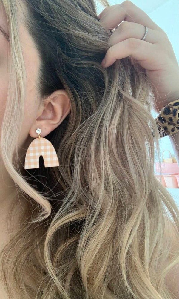 Needing fall earrings? Check out these gingham arches. They are simple but yet they will elevate your outfit. These earrings are handcrafted from polymer clay and acrylic paint was used to create the gingham pattern. Available in tan, mustard yellow, and soft orange. Please choose in the drop down.
