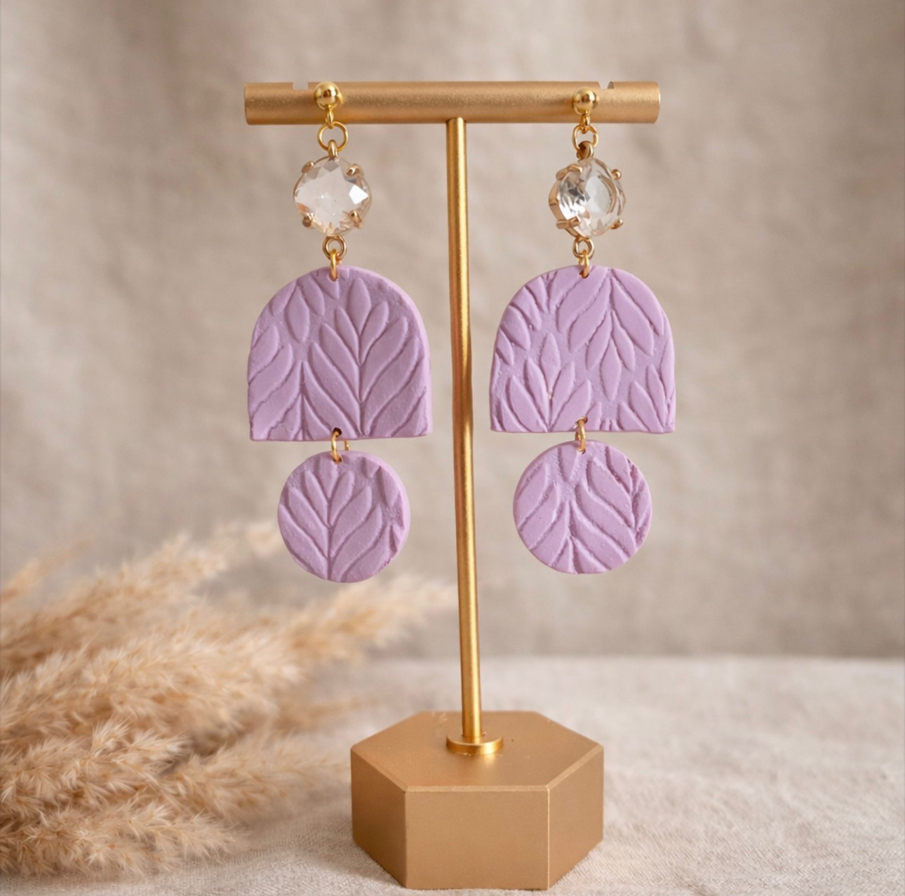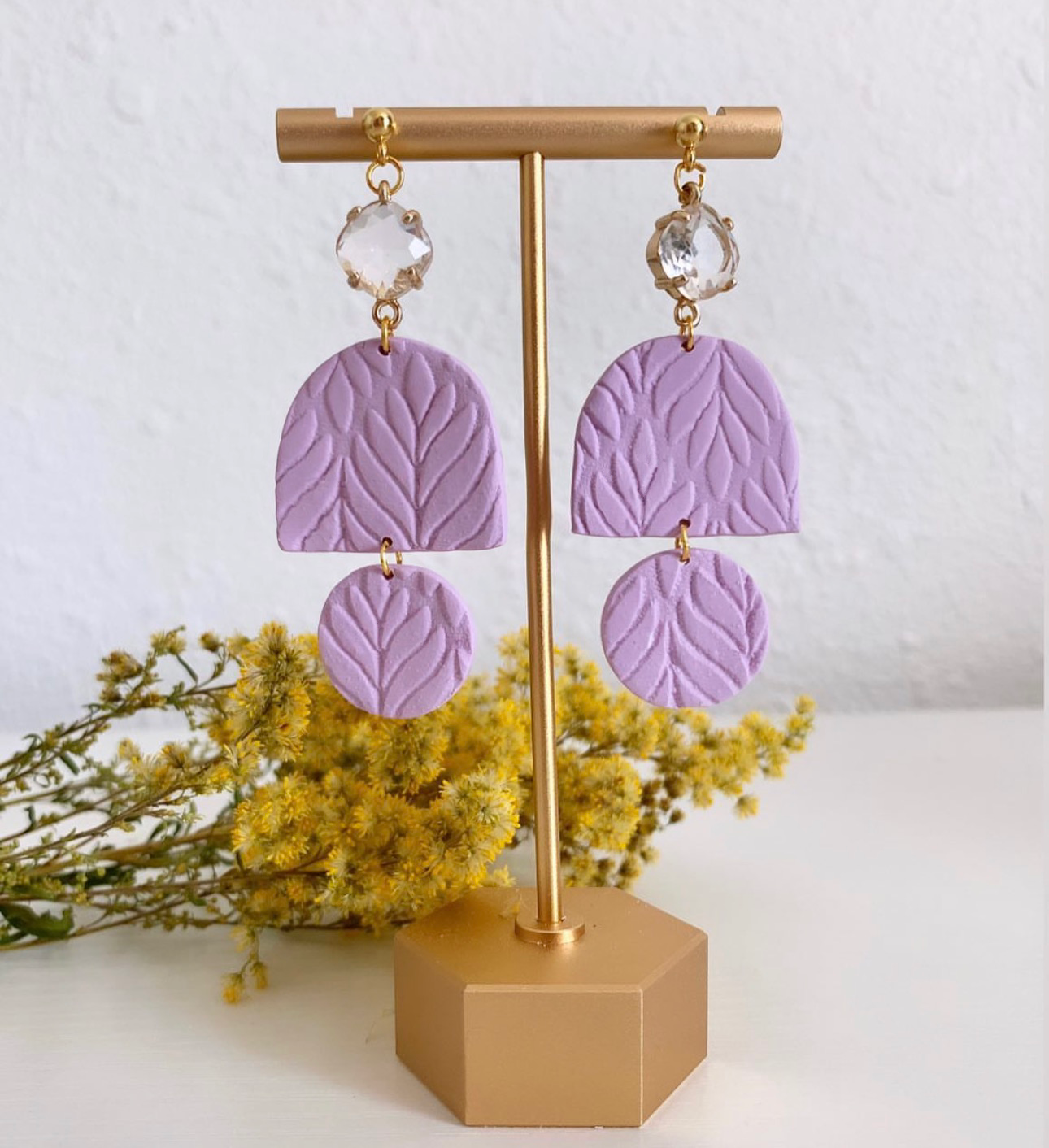 Ooh la la! Spring just got more stylish with these must-have earrings! I'm loving this color, lilac shade gives delicate feminine feels in my opinion. These polymer clay earrings have a nice leaf texture and a pretty clear gem at the top for a